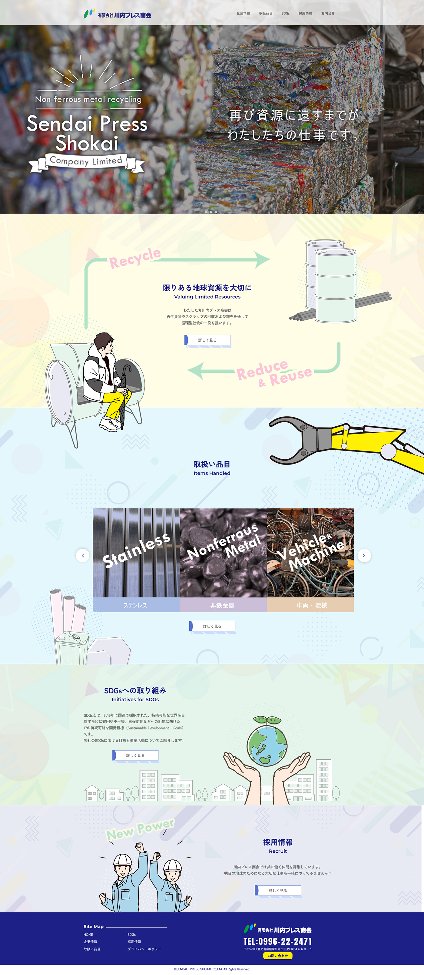 「有限会社川内プレス商会」様のサイトを作成しました。 ポップな幾何学模様を使った明るいデザインに仕上げています。